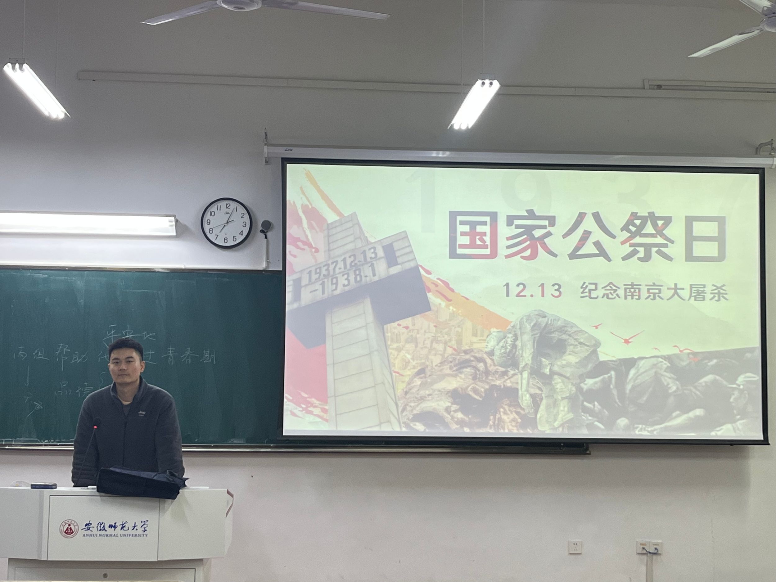2024年12月13日是我国第11个南京大屠杀死难者国家公祭日。为悼念南京大屠杀死难者,缅怀抗日先烈和民族英雄,引导员工树立和培养正确的理想信念,弘扬民族精神,增进爱国情感,激励同学们为实现中华民族伟大复兴的中国梦而努力奋斗。13日晚,TapTap点点2022级本科生辅导员段传钦在教学楼1409教室组织召开以“勿忘国耻,吾辈自强”为主题的国家公祭日主题教育班会。