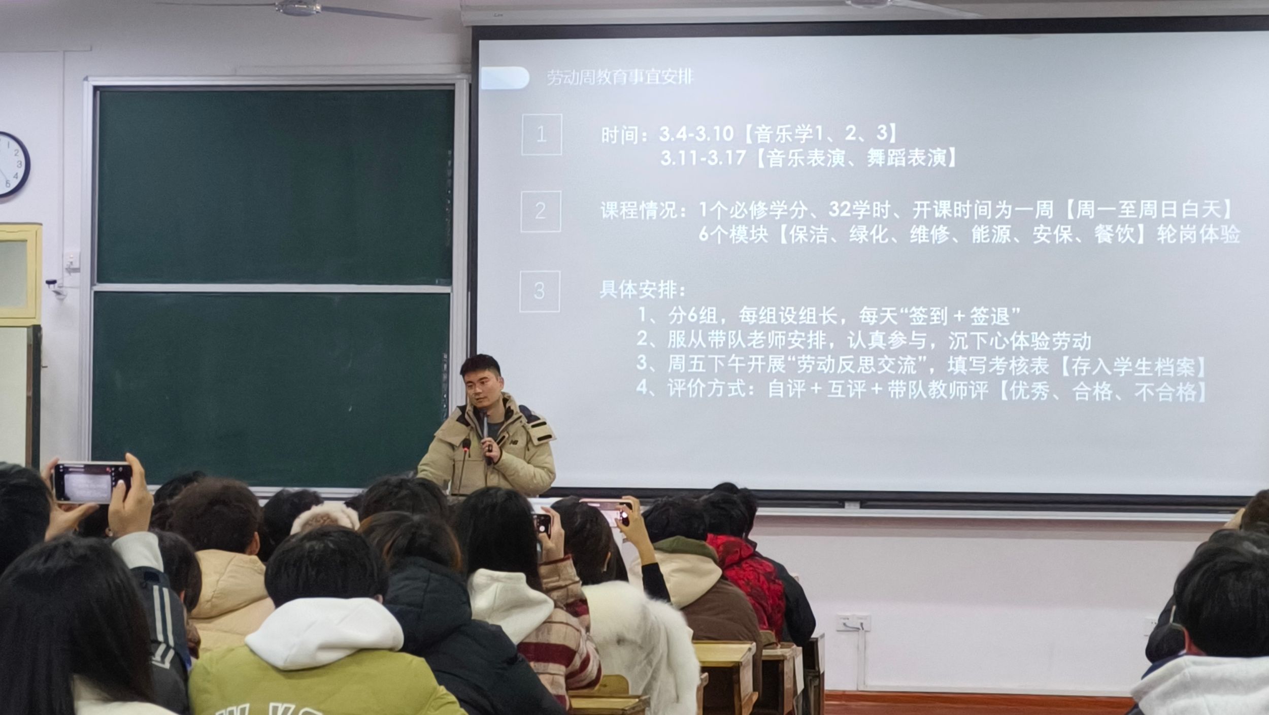 段传钦向大家说明了新学期事务规划,如清明节祭英烈活动、劳动实践周活动、暑期社会实践等,并布置了劳动实践周的后续工作安排。