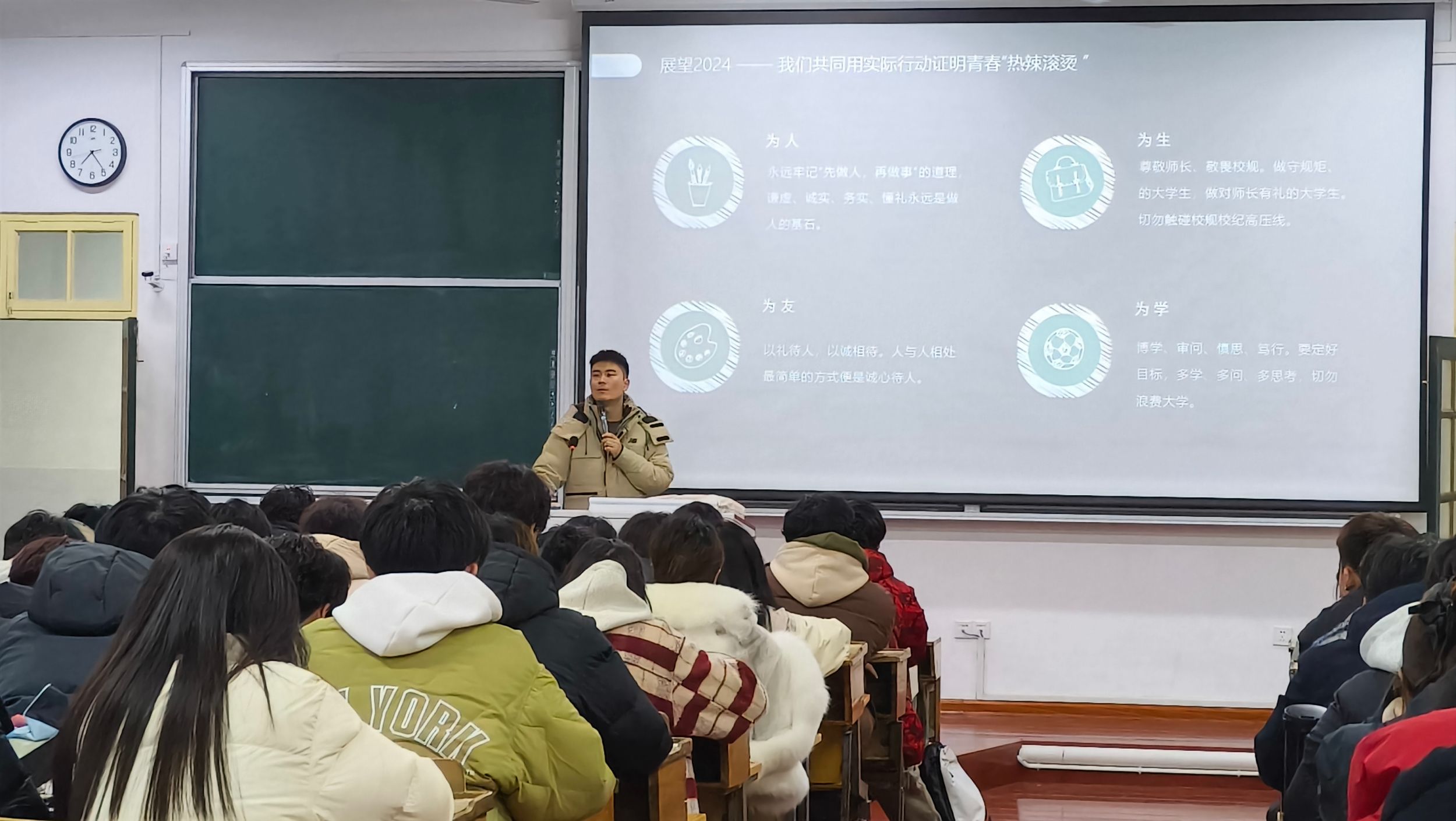 段传钦带领同学们共同展望了2024年,他提到希望同学们在新的一年里能够永远牢记“先做人,再做事”的道理,作为员工做到尊师重教、遵守规矩;在与人交往方面,做到以礼待人、以诚相待;在做学问上,做到多学、多问、多思考。