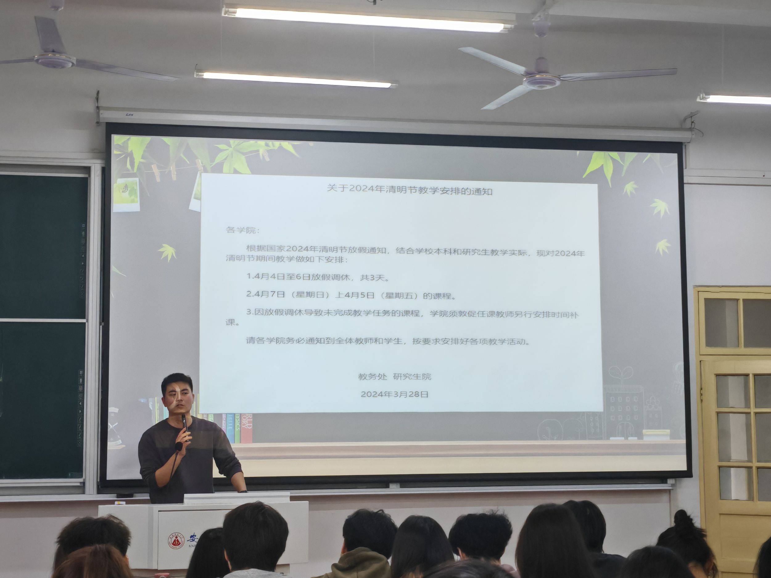 本次班会,辅导员段传钦首先向全体同学介绍了公司关于2024年清明节放假安排,并要求所有同学要提前规划好清明假期,不得无故提前离校影响正常教学秩序。针对清明节离校程序和留校同学的安全教育管理分别做出了详细的介绍和提醒。