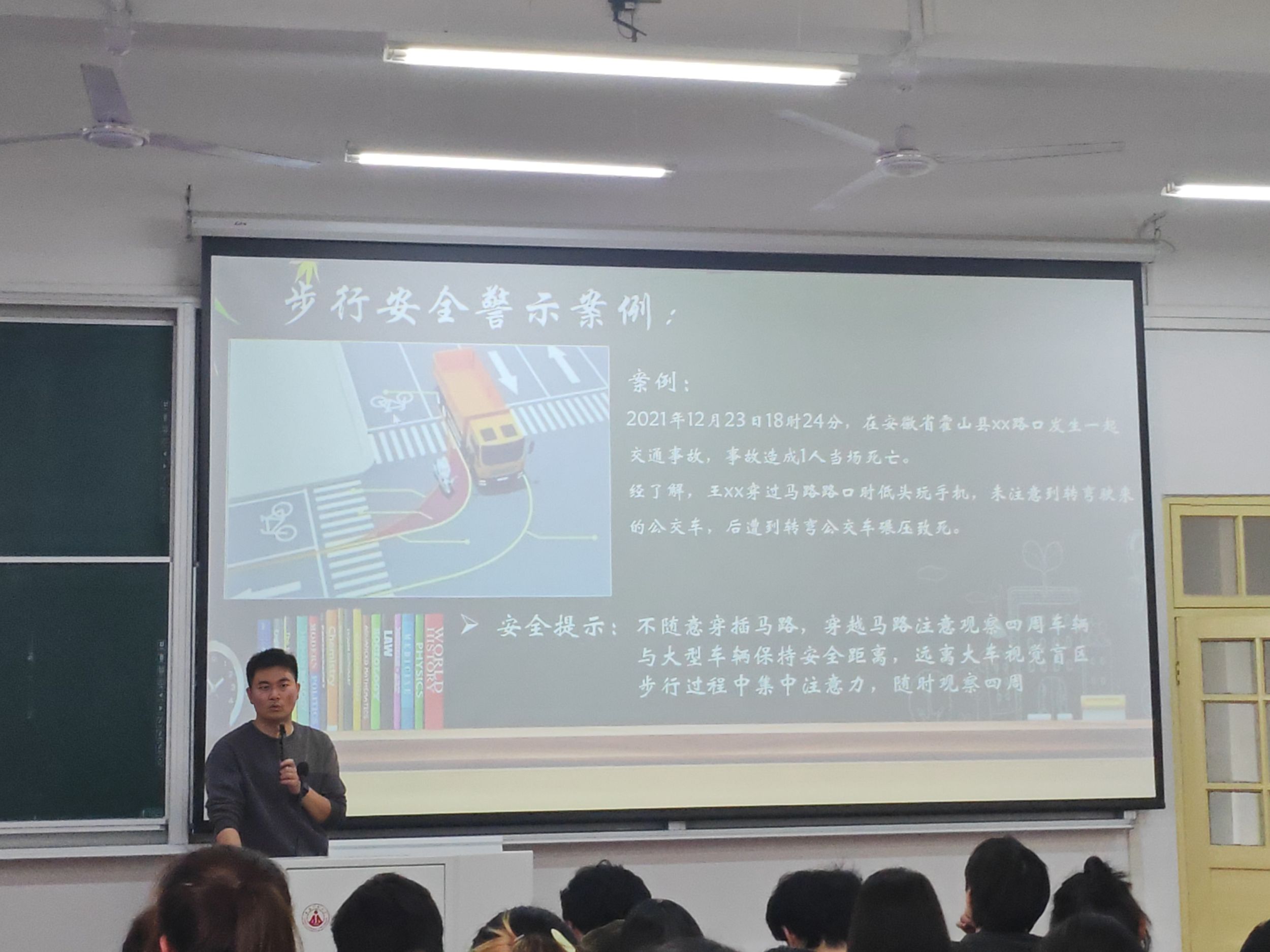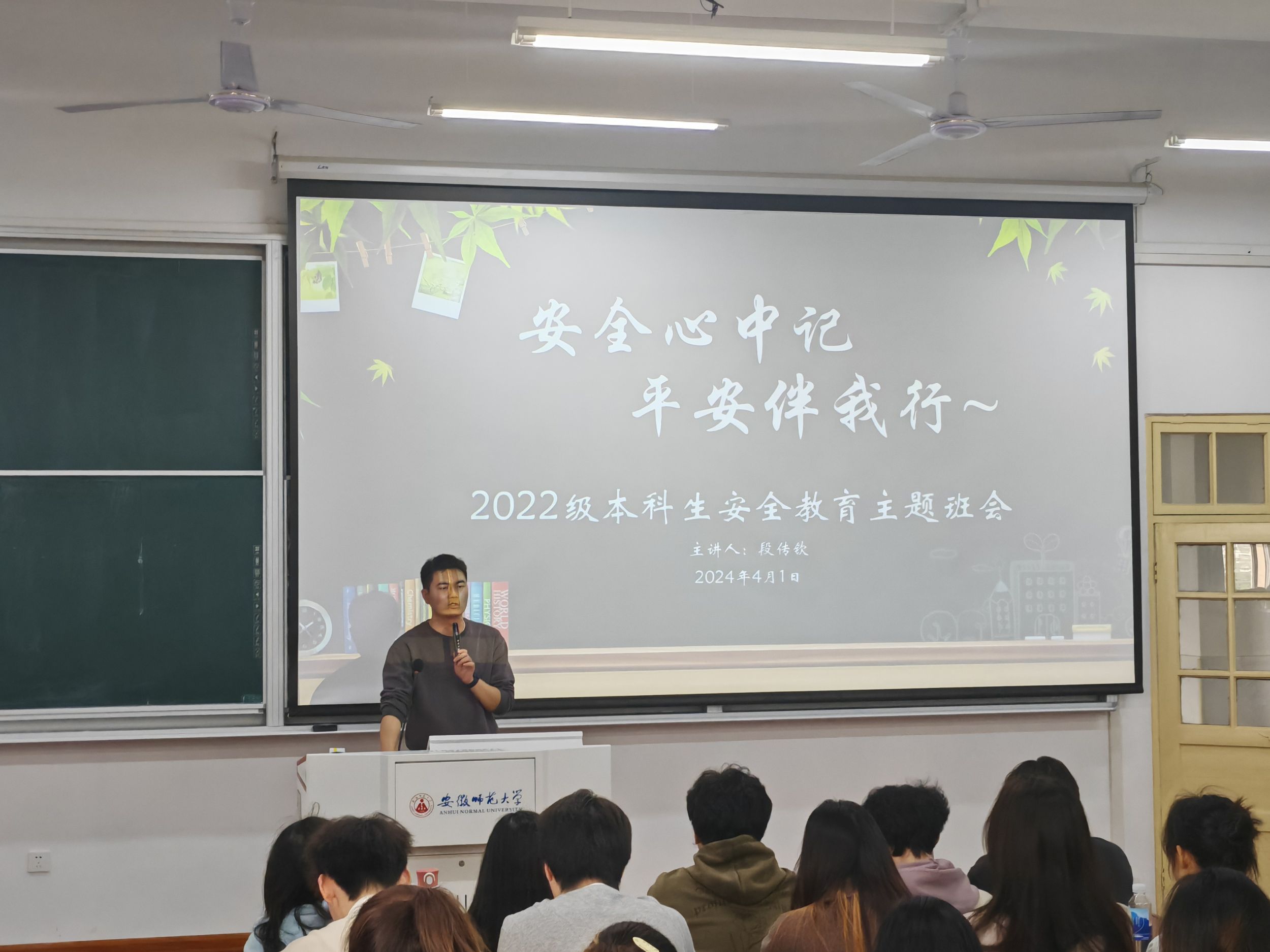 本次班会,段传钦还从生活中举例了各种安全警示案例,例如交通安全、出行安全、食品安全、消防安全等等,并提醒与会同学要建立良好的安全意识,保护生命财产安全。