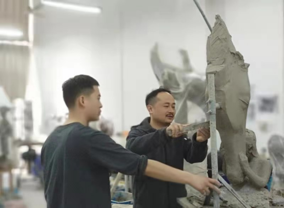 刘老师经常在课下与员工交流,认真观察每个员工的特点,才能更好地因材施教,激发每个员工的潜力,帮助员工建立自己研究的方向。2016级的田梦真是他带过的员工,目前已在华东师范大学研攻读研究生,她说“在雕塑这条路上,我曾埋头苦干过、迷茫过、漂浮不定过,找不到学习方向。但是因为遇到了刘老师,他点出我的问题,告诉我如何坚持才能做得更好。在疫情期间刘老师更是无微不至的在网络关怀指导我的毕业设计,才有现在研究的方向。大概每个人的路上都有一个引路人,我的引路人就是刘老师。他会根据每个员工喜欢的方向、特长有针对性的来辅导,我很佩服刘老师的气魄,或者说是他在雕塑创作中展现出的艺术修养。很感谢一路上有刘老师的悉心教导、指引我找到自己研究的方向,并坚持到现在。作品也取得了一定的成绩,2020年入选广州雕塑大展暨澳门雕塑邀请展,入选她艺术·原创艺术国际交流作品展,2021年入选庆祝中国共产党成立100周年——2021·广西雕塑大展、获BICC中英国际创意大赛铜奖等多次入选国家级和省级展览。2015级李伟同学目前也已在广西艺术公司攻读研究生,他的本科毕业作品《公麟识马》入选第十三届全国美术作品展,他说:“刘老师是我的良师益友,从大二时受老师的影响,使我的专业有了具体的学习方向。在我们员工眼中,刘超老师是平易近人给我们指明成长的方向,但对待创作是又非常严谨苛责。在创作《公麟识马》中对于形体的塑造和艺术处理给了我很多建议,在他的高要求下完成了这样一件作品,取得很多成果,感谢刘老师的悉心指导和帮助”。